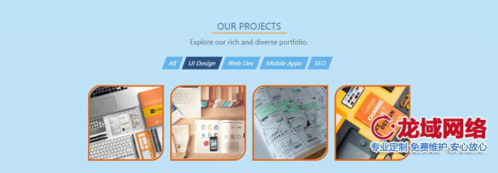 <div class="section bg-blue-200"> <div class="section-title">OUR PROJECTS</div> <div class="section-subtitle">Explore our rich and diverse portfolio.</div> <nav class="flex justify-center flex-wrap mt-4 mb-8 text-white"> <div class="h-8 mr-2 px-3 py-1 bg-blue-400 hover:bg-blue-600 text-center cursor-pointer -skewx-20">All</div> <div class="h-8 mr-2 px-3 py-1 bg-blue-800 text-center -skewx-20">UI Design</div> <div class="h-8 mr-2 px-3 py-1 bg-blue-400 hover:bg-blue-600 text-center cursor-pointer -skewx-20">Web Dev</div> <div class="h-8 mr-2 px-3 py-1 bg-blue-400 hover:bg-blue-600 text-center cursor-pointer -skewx-20">Mobile Apps</div> <div class="h-8 mr-2 px-3 py-1 bg-blue-400 hover:bg-blue-600 text-center cursor-pointer -skewx-20">SEO</div> </nav> <div class="flex justify-center flex-wrap"> <div class="w-48 h-48 m-2 hover:-mt-1 border-4 border-orange-600 rounded-tl-2xl rounded-br-2xl cursor-pointer hover:shadow-lg"> <img class="w-full h-full object-cover rounded-tl-2xl rounded-br-2xl" src="design1.jpg" /> </div> ... </div></div>